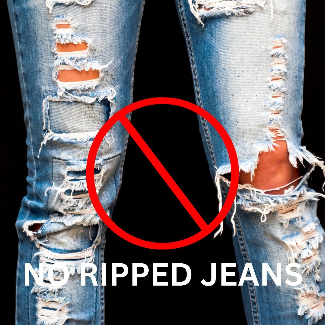 We expect, formal trousers or black / dark blue jeans – NO heavily bleached light blue jeans. No ripped, patched, paint adorned jeans.