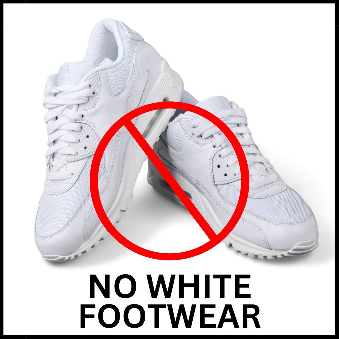 Footwear – shoes please (or all black sneakers at a minimum)! You’re not coming here to play sports, please do not attend wearing white sneakers – we don’t care how much you overpaid for them! If you need sneakers for medical reasons, then an all-black pair will cost you less than the expensive white ones you will be asked to remove at the front desk!
